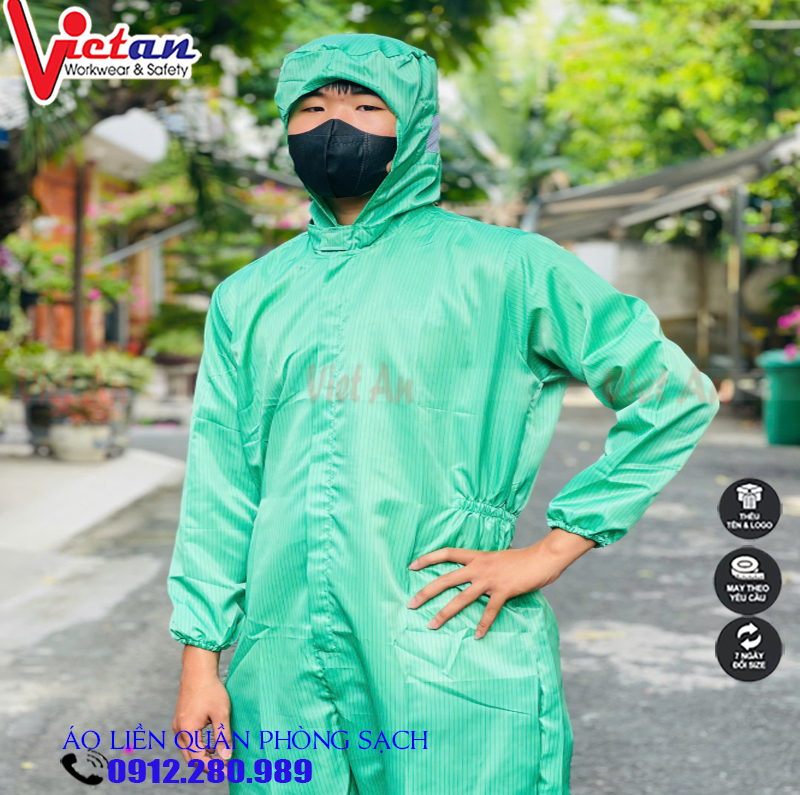 áo liền thân phòng sạch chống tĩnh điện sử dụng cho công nhân trong nhà máy làm việc hoặc của những người làm việc trong môi trường có yêu cầu độ sạch và có sự tĩnh điện.
