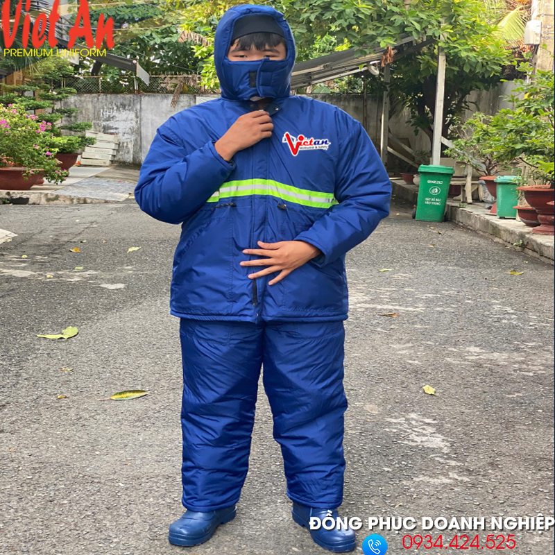 Áo kho lạnh do công ty Việt An sản xuất được sử dụng chất liệu vải poly chống thấm, lớp nỉ bên trong, lớp bông, vải giữ ấm