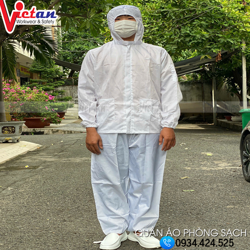 - Chất liệu vải : vải chống tĩnh điện dùng trong phòng sạch có gân sọc chạy dọc sớ vải, trơn, không bám bụi, không thấm nước.